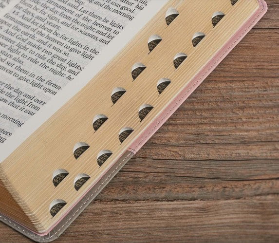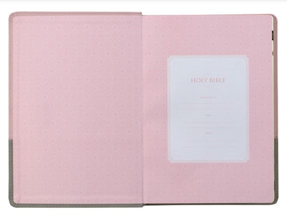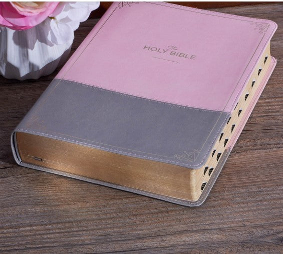 The Pink and Gray Faux Leather Super Giant Print King James Version Bible with Thumb Index with its super giant print is the perfect gift for a mature lady who prefers a larger font size and makes a beautiful birthday gift for a mother or grandmother.
