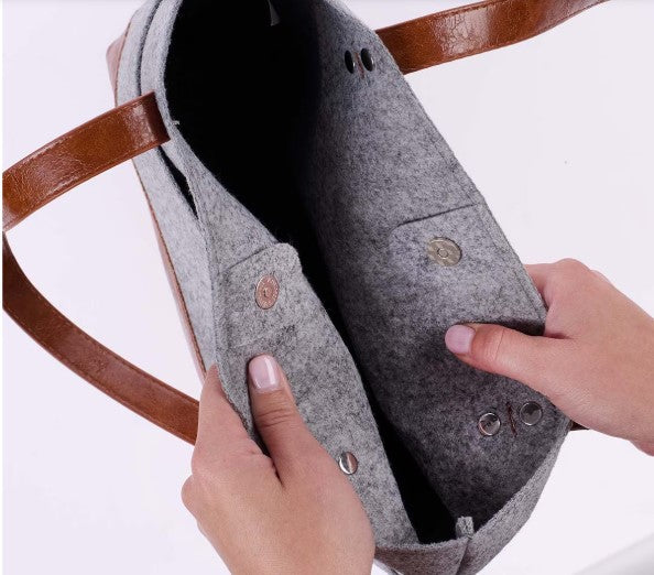 The soft, heather gray felt exterior is wrapped around the front and back of the tote to create two oversized pockets covering two-thirds of the body. An elaborately engraved silver badge shaped like a heart is centered between the two toffee-colored faux leather handles and matches the silver metal studs used to attach them.