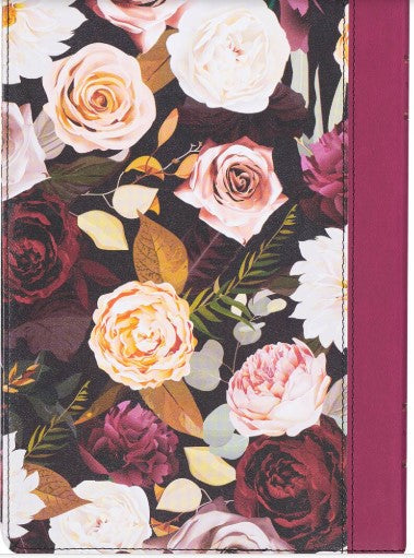 The back cover boasts a dark background overflowing with the same beautiful flowers. The title is artfully replicated in gold foil on the burgundy faux leather spine, while the version reference is set at the very top in gold-foiled letters.