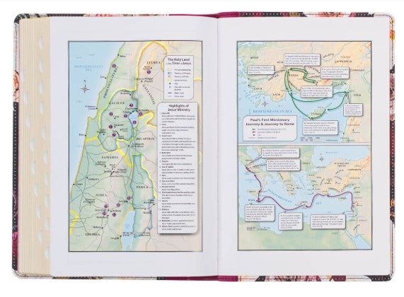 The Bible offers several features that enhance the reading experience. Its thin spine and lightweight binding ensure easy handling. The slightly larger 10-point type text is presented in a reader-friendly double-column format with helpful subheadings. A Scripture verse finder is organized by topic to aid in locating specific verses. Additionally, eight full-color maps provide geographical context, while the words of Christ are printed in red for emphasis. A one-year Bible reading plan is included for those seeking structure to keep them motivated. The Bible is elegantly packaged in a full-color printed cardstock sleeve.
