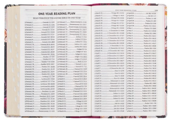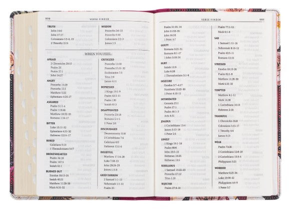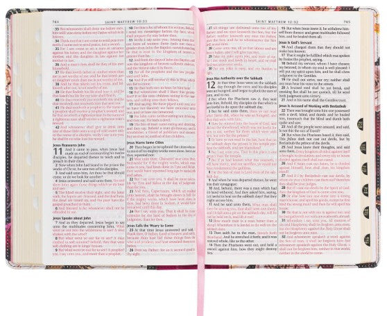 Thumb indexing tabs and gilt-edged pages are luxury features that elevate the design of this Thinline Bible. Other design features include a pink satin ribbon marker to mark your page, a lay-flat binding, and a presentation page that can be completed when the Bible is given as a gift.