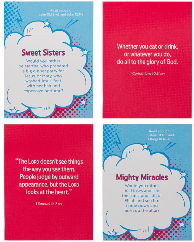 This card set brings 44 fun, family-friendly conversation starters to the table! Each card kicks off with a unique, Bible-based question in a playful comic book design. Flip it over, and you'll find a Scripture verse on a solid color background to guide the conversation. The full-color cards are printed on glossy cardstock.